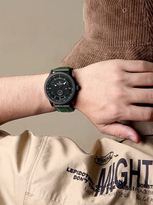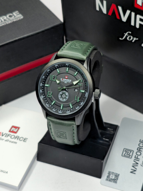 ساعت مچی مردانه Naviforce مدل NF9229 با طراحی اسپرت و فول تایم، ترکیبی از استایل مدرن و عملکرد دقیق را ارائه می‌دهد. بند چرمی سبز ارتشی در کنار صفحه مشکی مات، ظاهری خاص، ماجراجویانه و مردانه به این ساعت بخشیده است؛ مناسب برای کسانی که دنبال ساعتی متفاوت و چشم‌گیر هستند.این مدل از موتور کوارتز فول تایم با دقت بالا بهره می‌برد و علاوه بر نمایش ساعت، دقیقه و ثانیه، دارای نمایشگر روز هفته و تاریخ نیز هست. قاب از آلیاژ مقاوم در برابر ضربه ساخته شده و شیشه معدنی ضدخش، از صفحه ساعت محافظت می‌کند.مقاومت در برابر آب تا عمق 3ATM باعث می‌شود ساعت در برابر رطوبت و شست‌وشوی دست مقاوم باشد. بند چرمی سبز با دوخت ظریف و قفل مقاوم، حس راحتی و استحکام را هم‌زمان منتقل می‌کند.Naviforce NF9229 انتخابی عالی برای آقایانی است که به دنبال ساعتی با طراحی خاص، رنگی متفاوت و کارایی بالا هستند — ساعتی که با هر استایل اسپرت یا روزمره‌ای هماهنگ می‌شود و امضای خاصی به ظاهر شما می‌دهد.