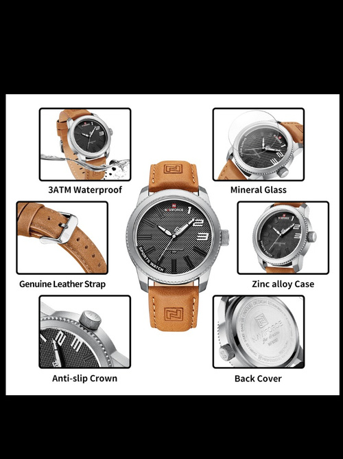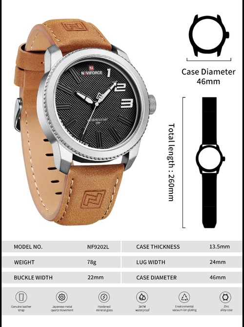 دارای لوگو حک شده Naviforce رو و پشت صفحه و سگک ساعت می باشد.