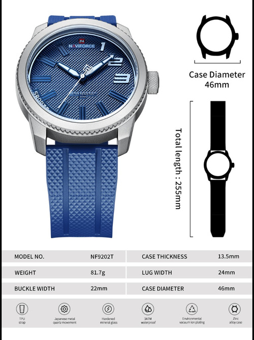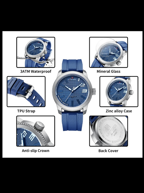 دارای لوگو حک شده Naviforce رو و پشت صفحه و سگک ساعت می باشد.